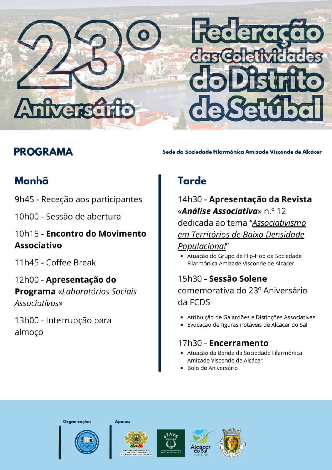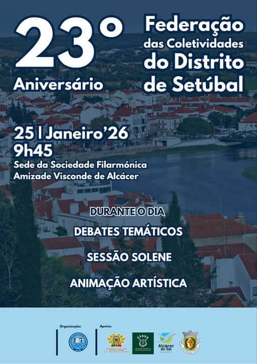 Debates temáticos, uma sessão solene e animação artística dão o mote para as comemorações do 23.º aniversário da Federação das Coletividades do Distrito de Setúbal, que decorre em Alcácer do Sal no próximo domingo. O evento é aberto ao público decorre no próximo dom Ingo a partir das 9h45 na Sede da Sociedade Filarmónica Amizade Visconde d’Alcácer (S.F.A.V.A. – “Calceteira”).